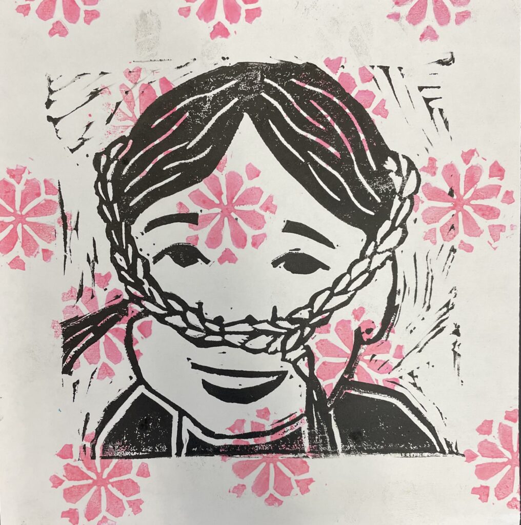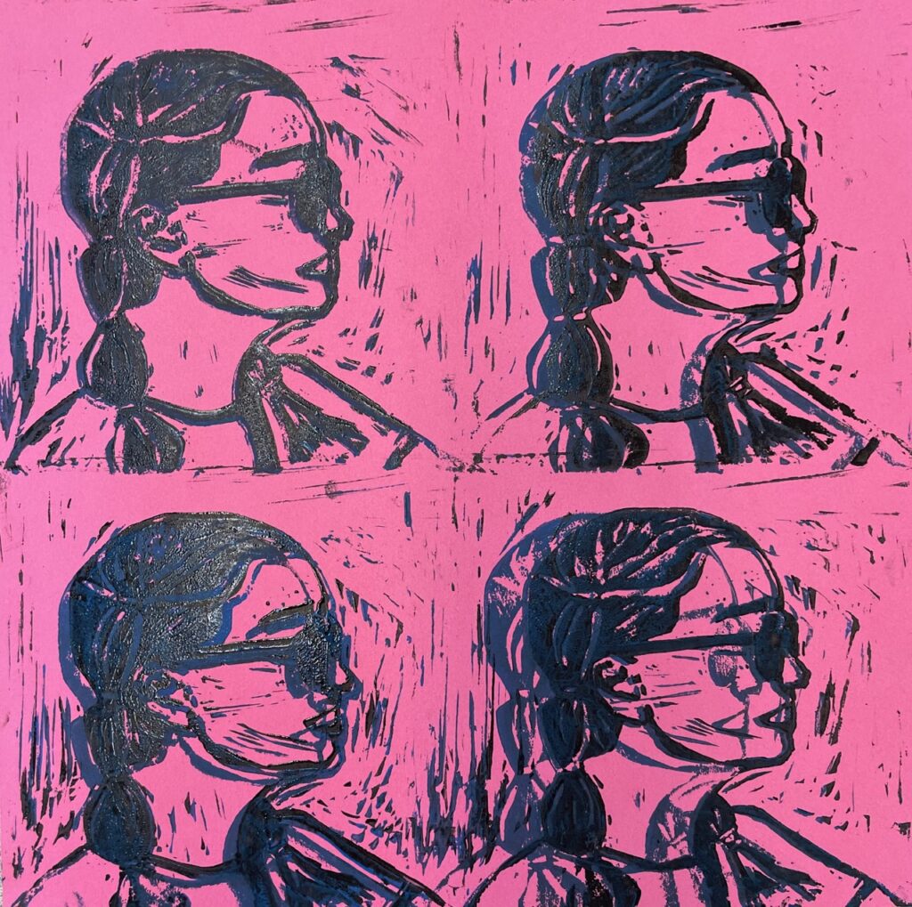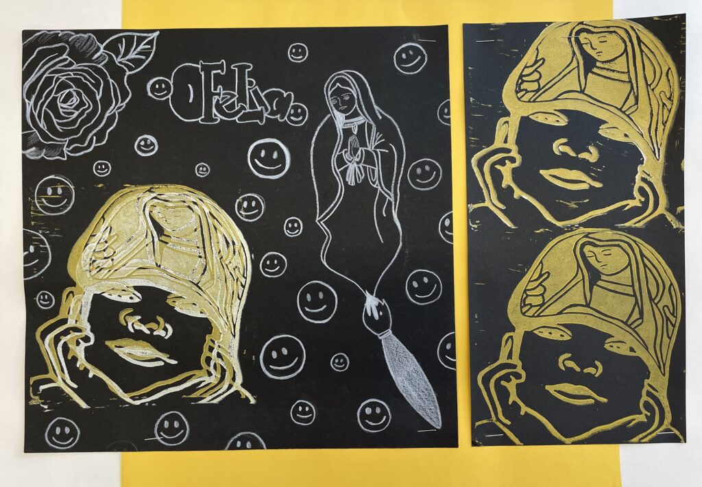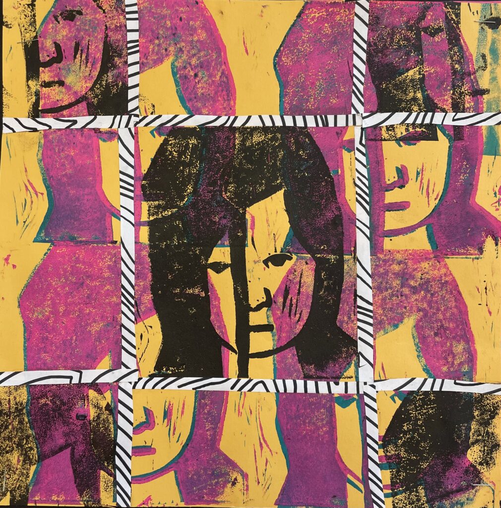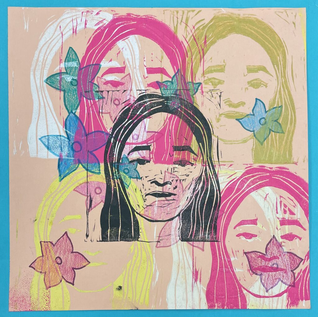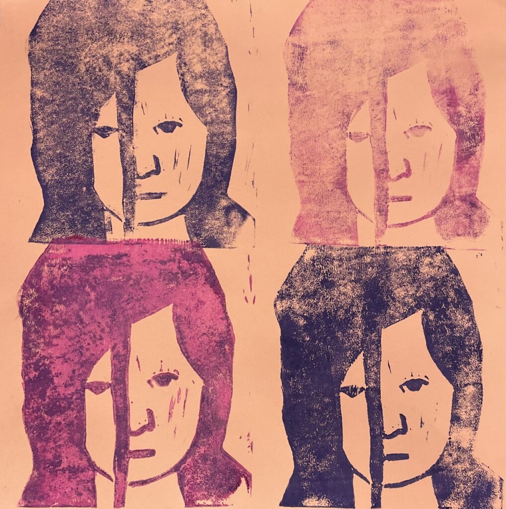 In this lesson students will look at, and respond to, artists who explore and express identity through portraiture in different ways. Taking inspiration from those artists, and spending time on self reflection, students will create a linocut portrait and a variety of different backgrounds to print that portrait on. Students will have the freedom to create their portrait using a photograph, or by drawing an abstract, stylized, or distorted portrait. In creating the backgrounds students will have the freedom to use any materials that are available to them, and that they can print on. However they will also be given a set of options to guide them, and will create several specific options throughout the lesson that can be used for their final prints or to test on. The focus on identity will be open for students to explore whatever aspects or interests are most important to them at the time of art making, but they will be encouraged to think about what brings them joy. After final printing students will choose the final print or prints that they feel best represent themselves and create a self reflection/artists statement.