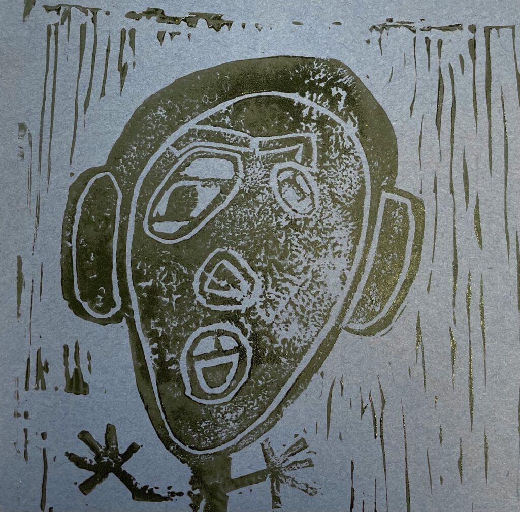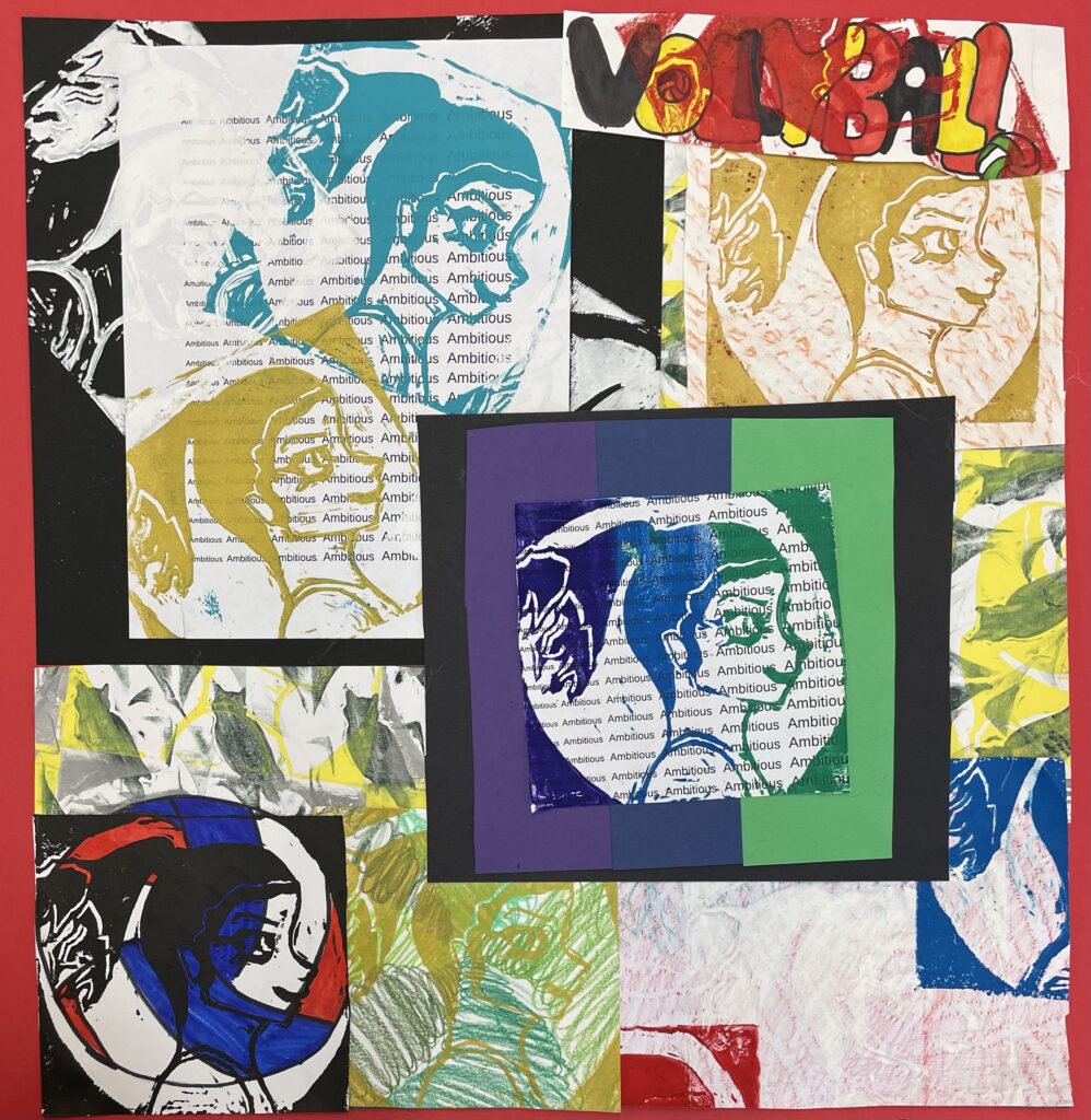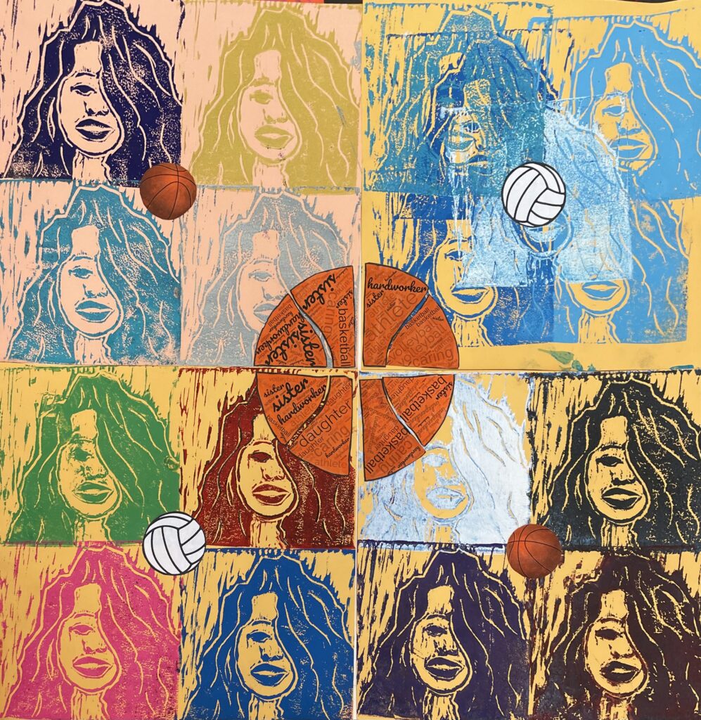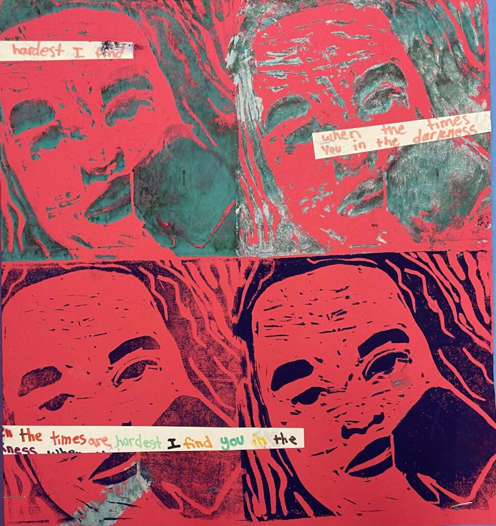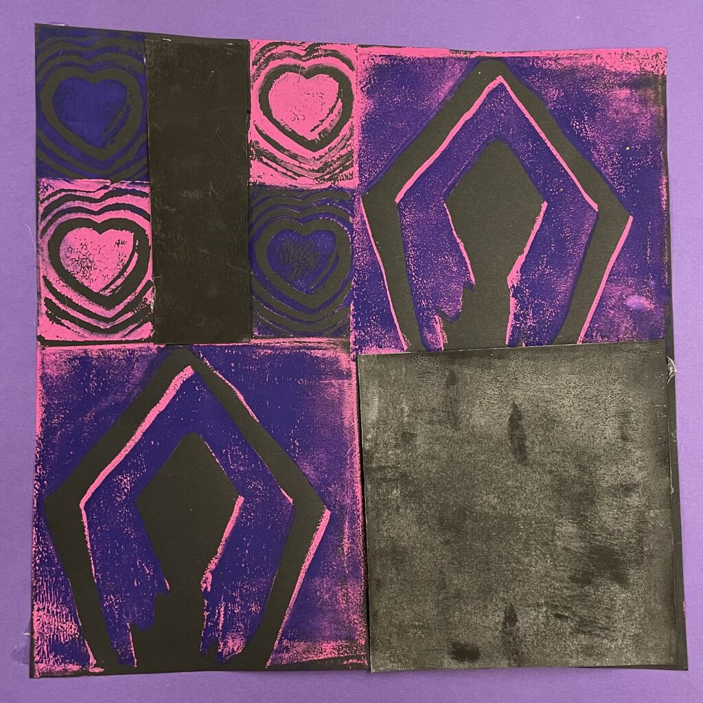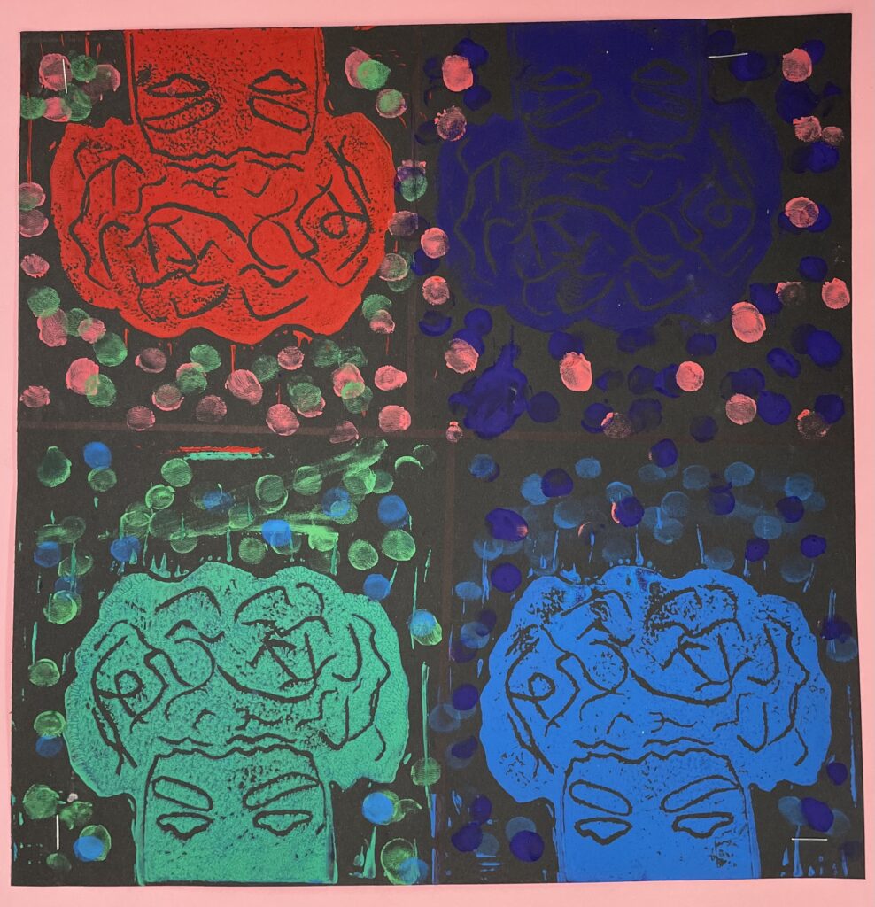 In this lesson students will look at, and respond to, artists who explore and express identity through portraiture in different ways. Taking inspiration from those artists, and spending time on self reflection, students will create a linocut portrait and a variety of different backgrounds to print that portrait on. Students will have the freedom to create their portrait using a photograph, or by drawing an abstract, stylized, or distorted portrait. In creating the backgrounds students will have the freedom to use any materials that are available to them, and that they can print on. However they will also be given a set of options to guide them, and will create several specific options throughout the lesson that can be used for their final prints or to test on. The focus on identity will be open for students to explore whatever aspects or interests are most important to them at the time of art making, but they will be encouraged to think about what brings them joy. After final printing students will choose the final print or prints that they feel best represent themselves and create a self reflection/artists statement.